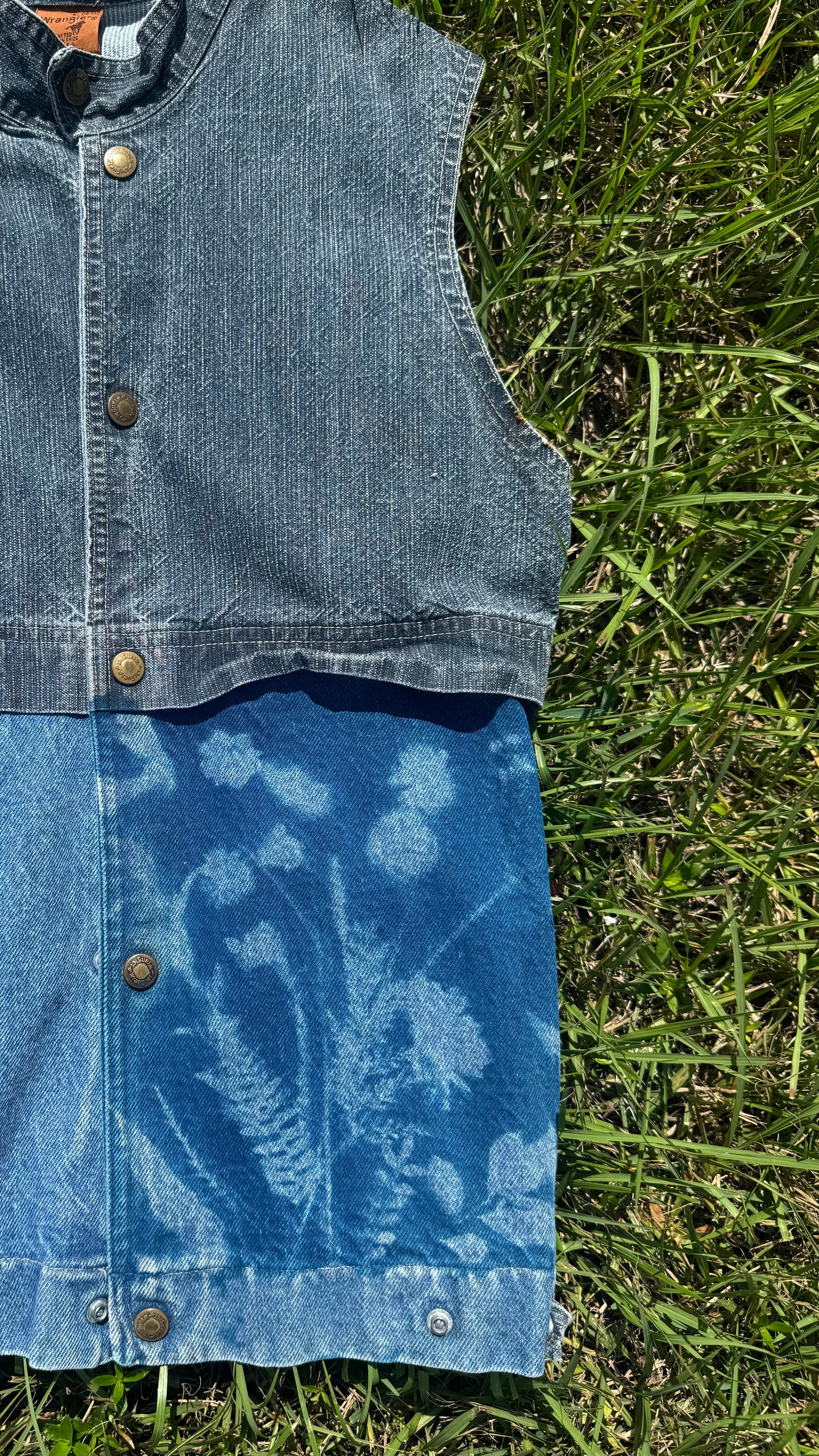 Two tone vintage wrangler denim vest; size says XL, fits s/m